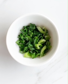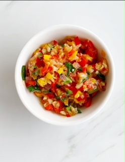 2.In a pan add oil and fry the onions,red and green capsicum ,garlic & the spring onion greens . Add salt and pepper to taste and gently sauté it for a min or two.
